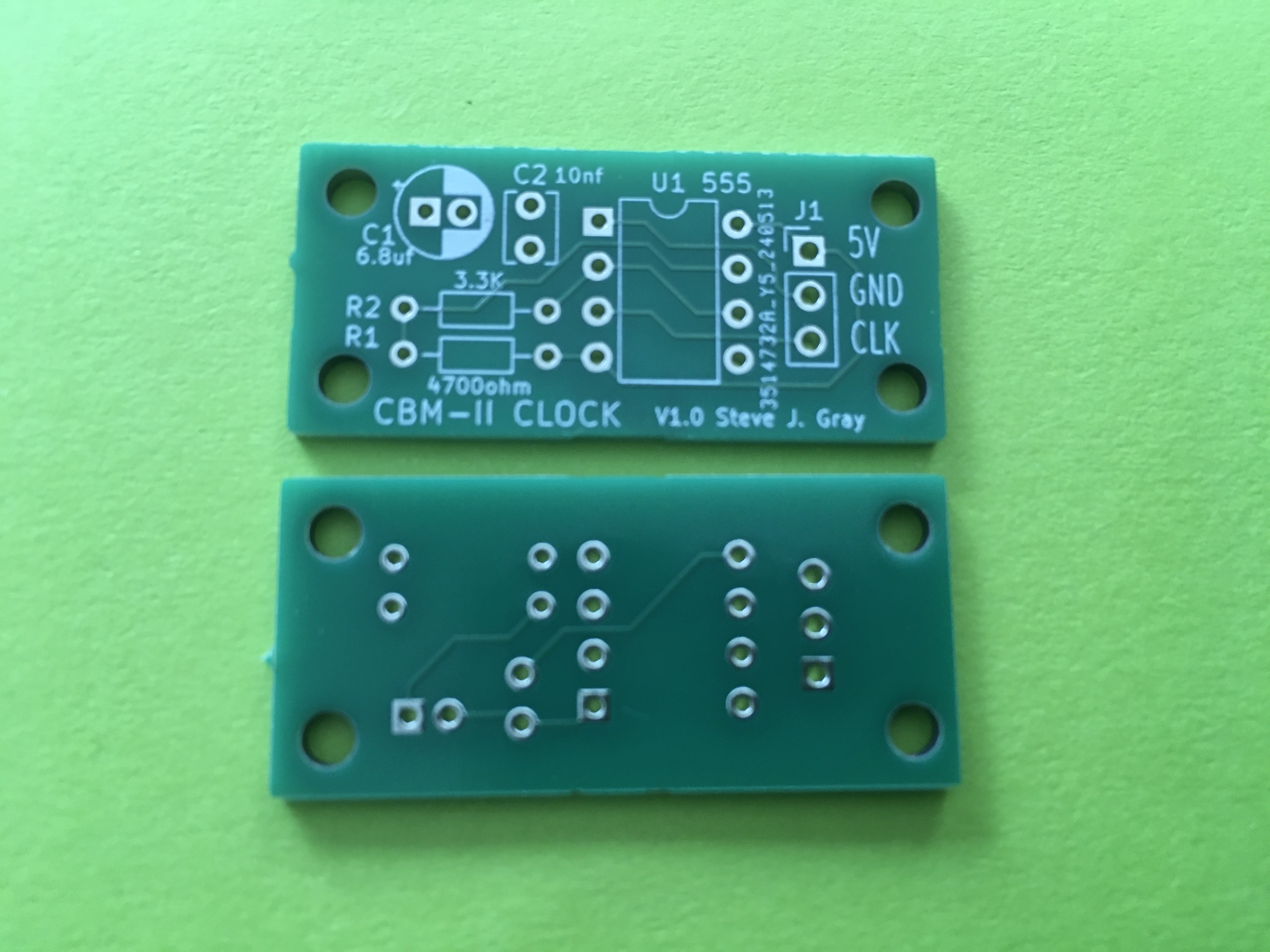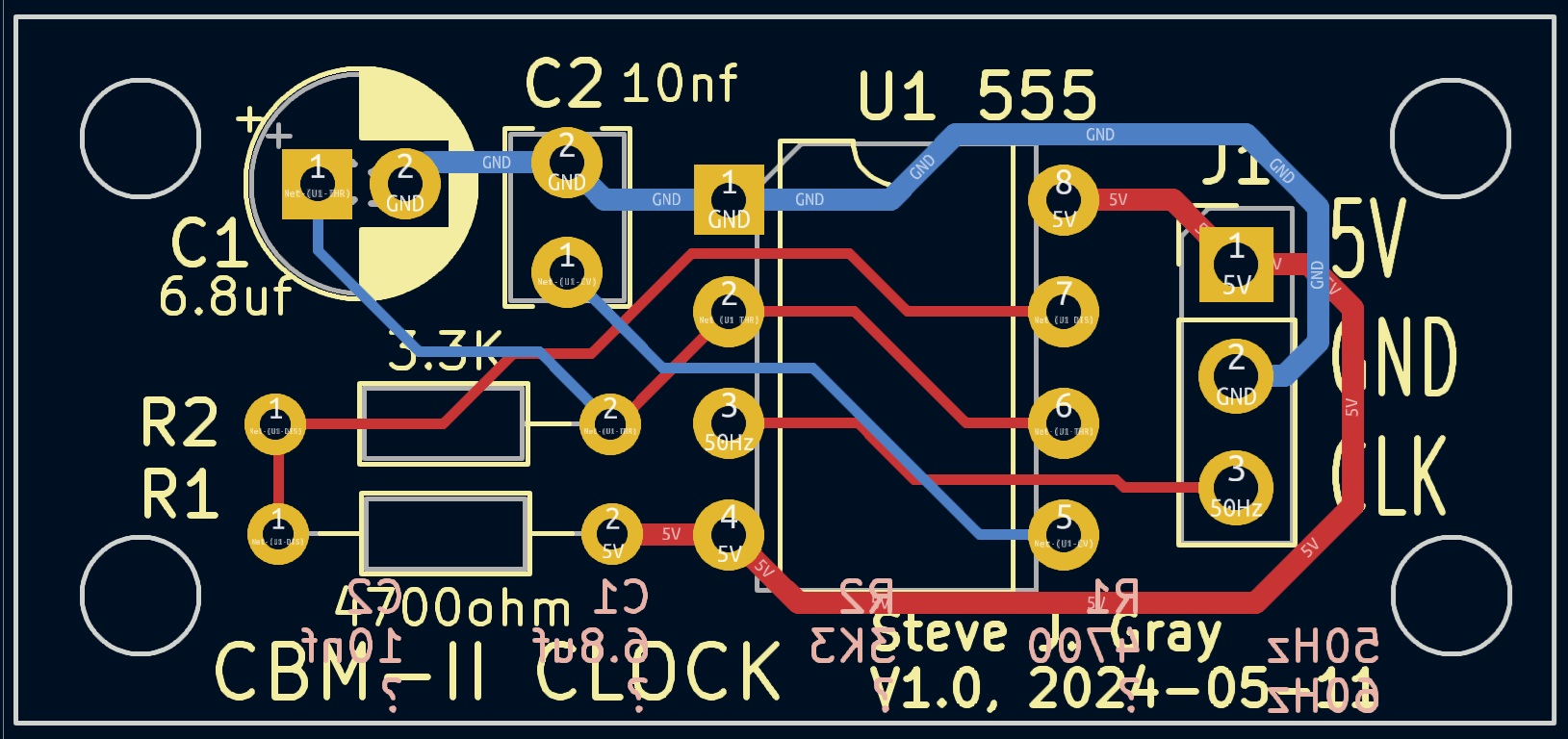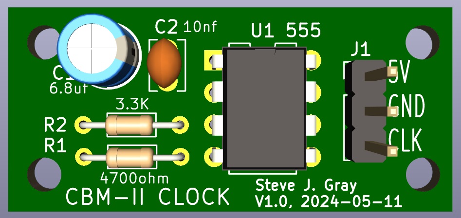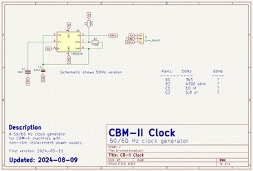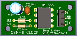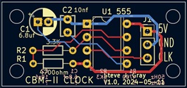 Welcome to the CBM-II Clock Page! The CBM-II machines have a special power supply that also supplies either a 50 or 60 Hertz signal to the CBM-II motherboard in order to feed the Time-of-Day (TOD) clock. If your power supply fails and you can't find another you can use standard power supplies, like those from Meanwell but they won't have the proper TOD clock. This board is a simple 555 timer chip circuit and PCB to generate the clock signal that you need. It is small so should mount in any convenient place depending on your power supply size and whether you have an LP or HP machine. .