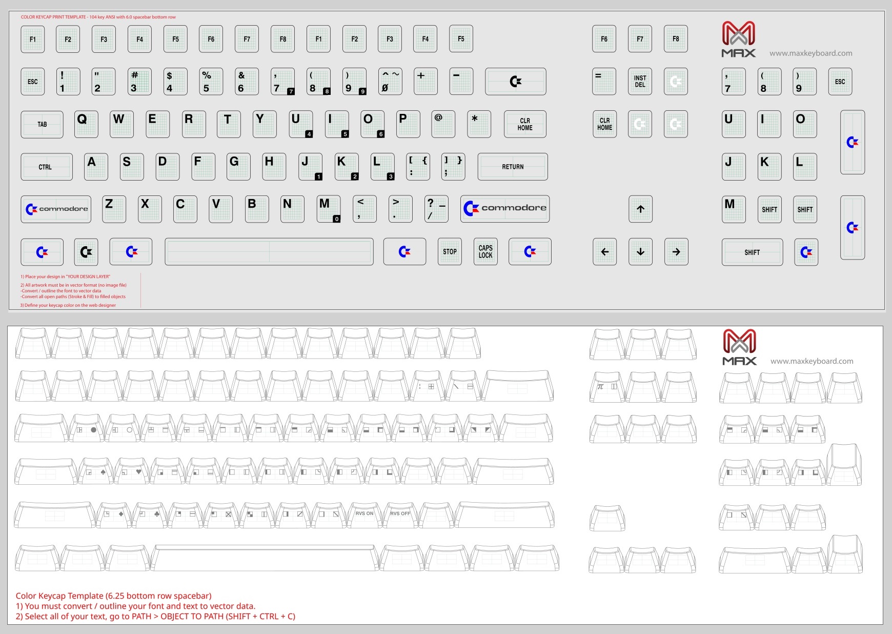 For MX keycaps I decided to use MaxKeyboard.com again like I did for the V364 project. They offer a Custom Color Printed Keycaps service that uses a dye-sublimation process. Each key can be a different colour, from a choice of over a dozen colours. You provide the vector artwork for each key using their keyboard templates. You can put basically anything you want on each key. To recreate the CLCD keyboard I used a high-resolution scan of an actual bare CLCD keyboard provided by Bo Zimmerman. I matched the font and symbols as best I could, and created the graphics symbols all in vector format. I selected the 104 key layout in order to get enough keys of the proper size and key row. There were extra keys which I used to make some alternate versions of some keys (ie: letter keys without the numeric pad) and a few other keys. I used beige keycaps for the CLCD keys, but I also did an extra set of F-Keys in rainbow colours so I could have samples of the different colour keycaps that they offer. I also made some extra C= keys for fun!